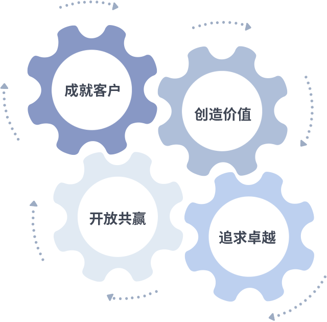 成就客户是一切决策的出发点,,创造价值是衡量所有工作的标准,,追求卓越是我们做事做人的态度,,,开放共赢是我们的格局也是最终的结果。。价值观的齿轮环环相扣,,推动着组织里的每个人不断向前。。。